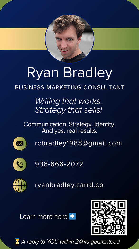 Ryan Bradley is a business design consultant and narrative strategist based in Texas.He has written and executed marketing strategies for luxury real estate firms, supported emerging startups, and developed pitch-ready product frameworks from scratch.He brings experience in:- Copywriting and UX flow- Client relationship strategy- Market-positioned storytelling- Internal training & team messaging- Brand identity scaffolding_________________Former educatorLifelong communicatorCurrently building the kinds of systems that solve real-world frictions, and get adopted fast!